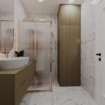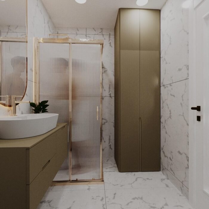 Nervürlü cam dolap kapakları, mekâna derinlik ve zarafet katarken; rose gold armatür detayları ortama lüks bir dokunuş ekler.